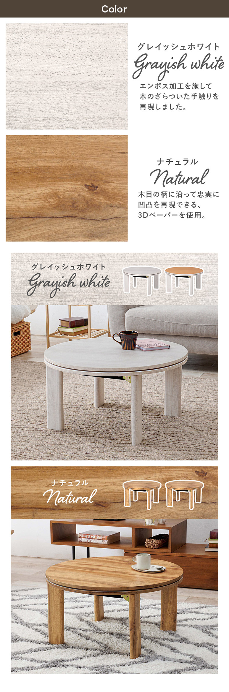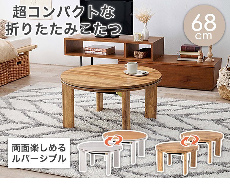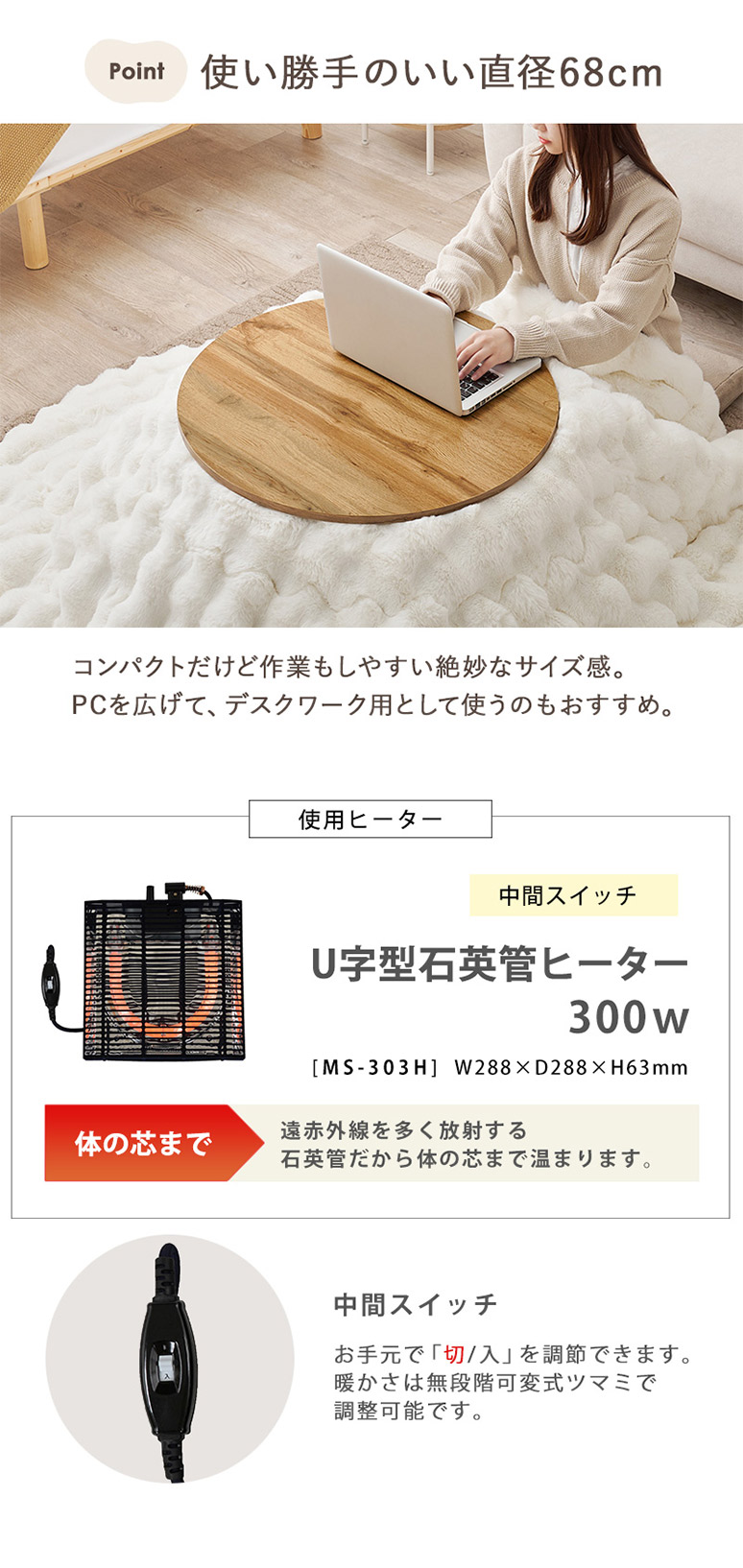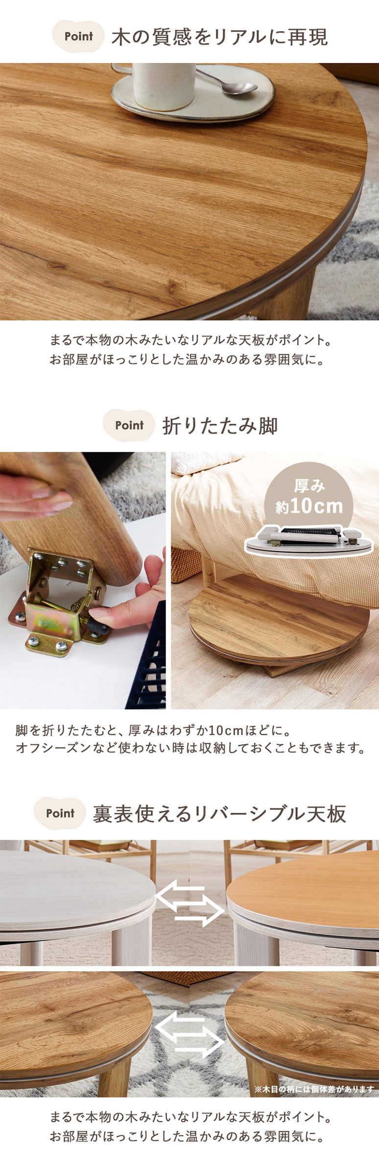 | ● ここがポイント ● 〇コンパクトで折りたたみ可能な円形のカジュアルこたつです。 〇脚を簡単に折りたたむことができる折れ脚タイプです。 〇使わないオフシーズンには、脚を畳んで家具の隙間などにコンパクトに収納でき、部屋を広く使えます。 〇冬はこたつ布団をかけて暖房器具として、他の季節は布団を外しておしゃれなローテーブルとして一年中活躍します。 〇天板が裏表使えるリバーシブル仕様です。気分やインテリアに合わせて簡単に模様替えができます。 〇300W石英管ヒーターを採用。遠赤外線を多く放射する石英管ヒーターは、体の芯まで温まります。 〇中間スイッチ付きで、手元で電源操作と温度調整が可能です。 |