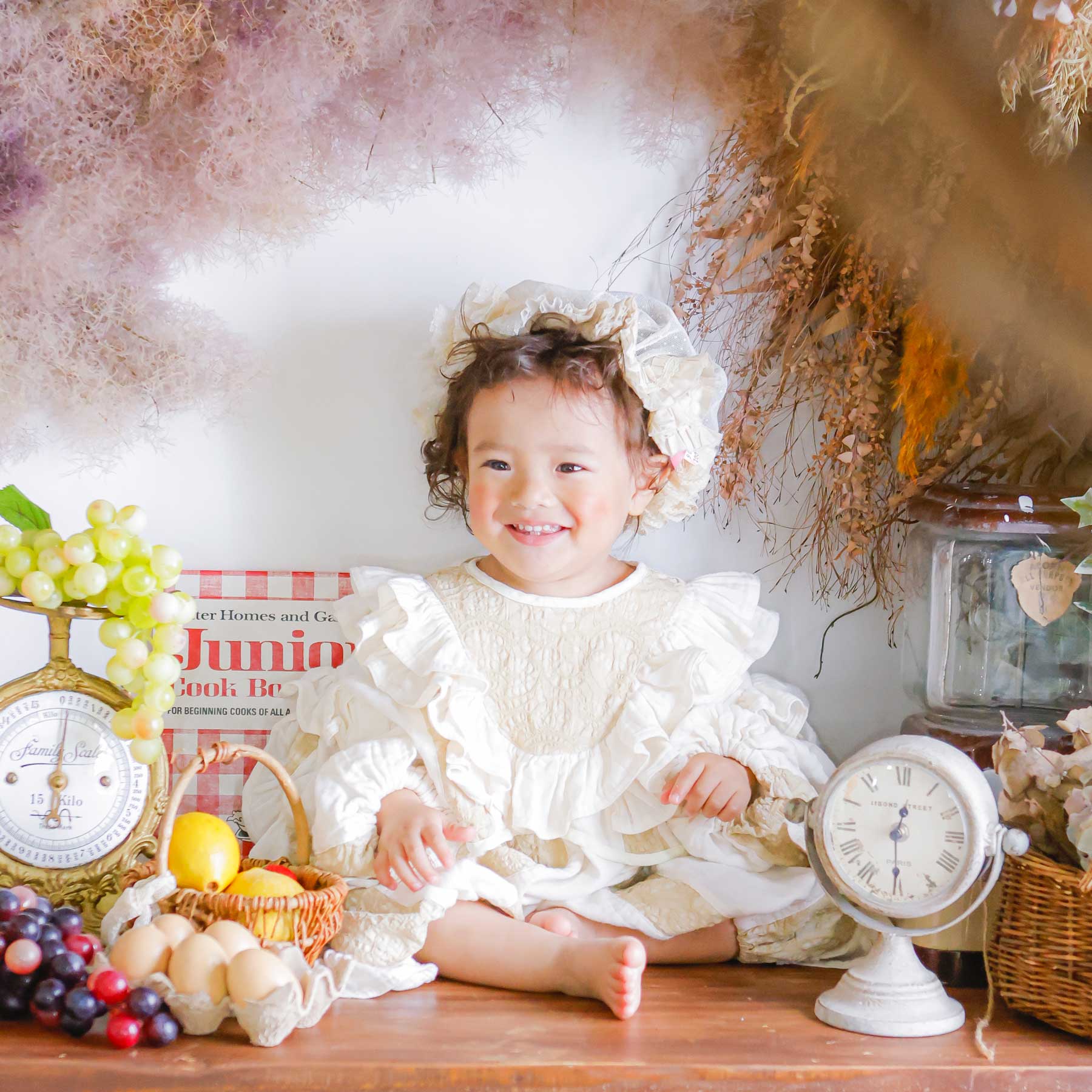 キッズレンタル衣装 波打つフリルのナチュラルガーゼセットアップ 80〜100サイズ