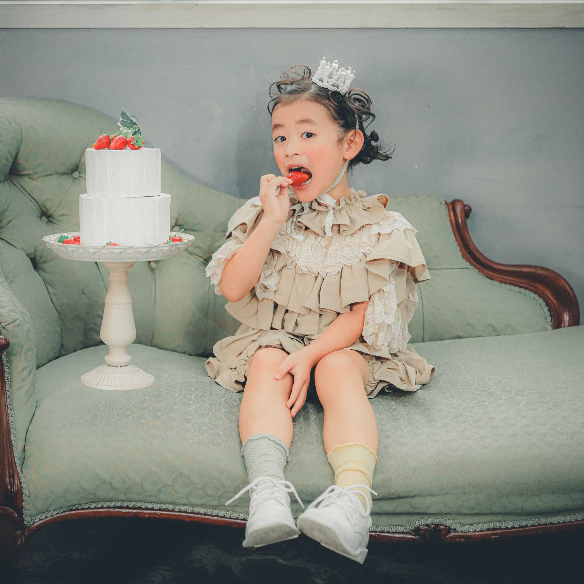 足元までたっぷりフリルが施されていますので、たっちのまだできない小さなお子様でも足をすっぽり隠した状態、ねんねやハイハイポーズでも素敵に撮影していただけます。更にたっちができてから同じ衣装で記念写真という形も成長を感じられておすすめです。