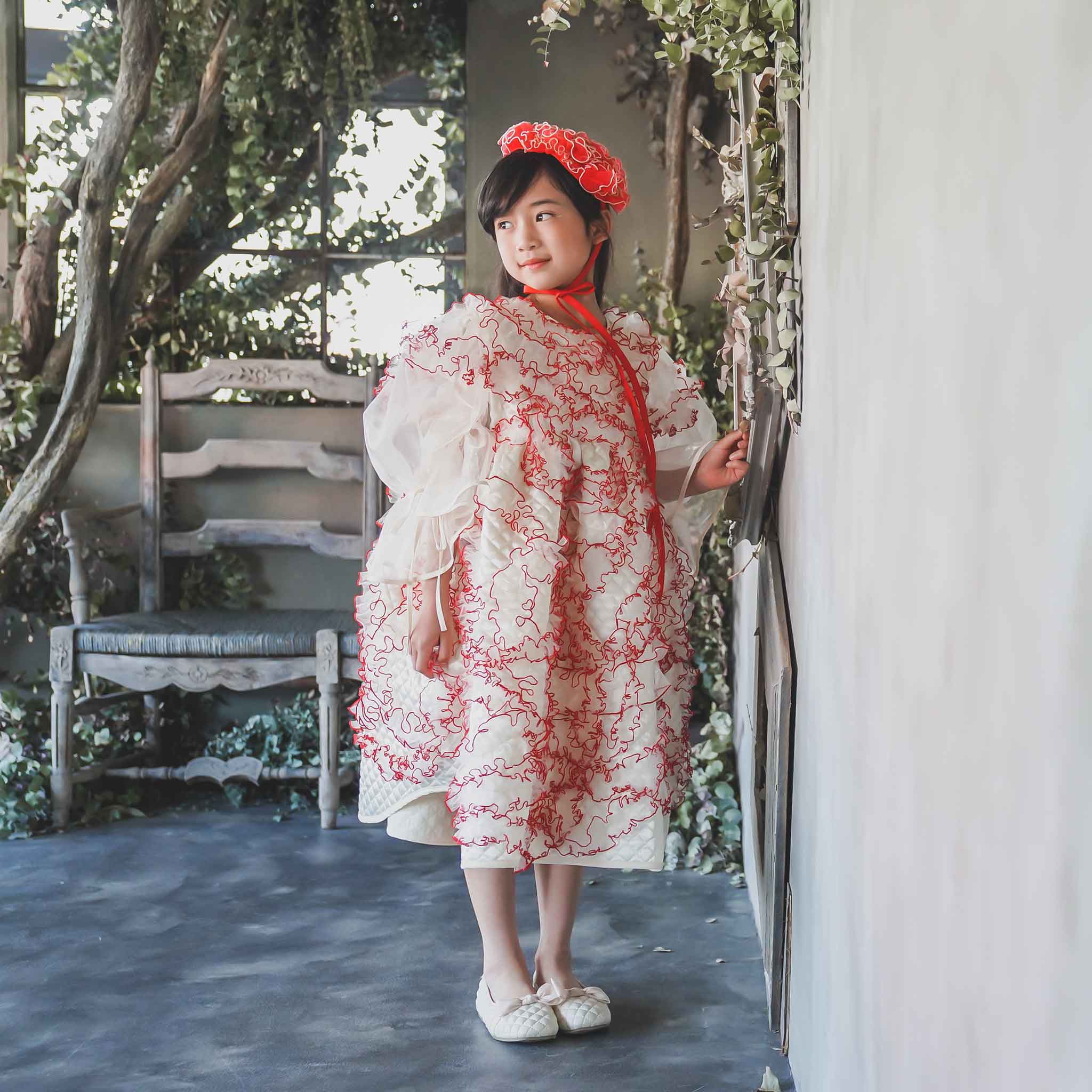 ホワイトキルティングのドレスに、赤い縁取りがされたエッジングフリルをたっぷりとあしらったドレスです。