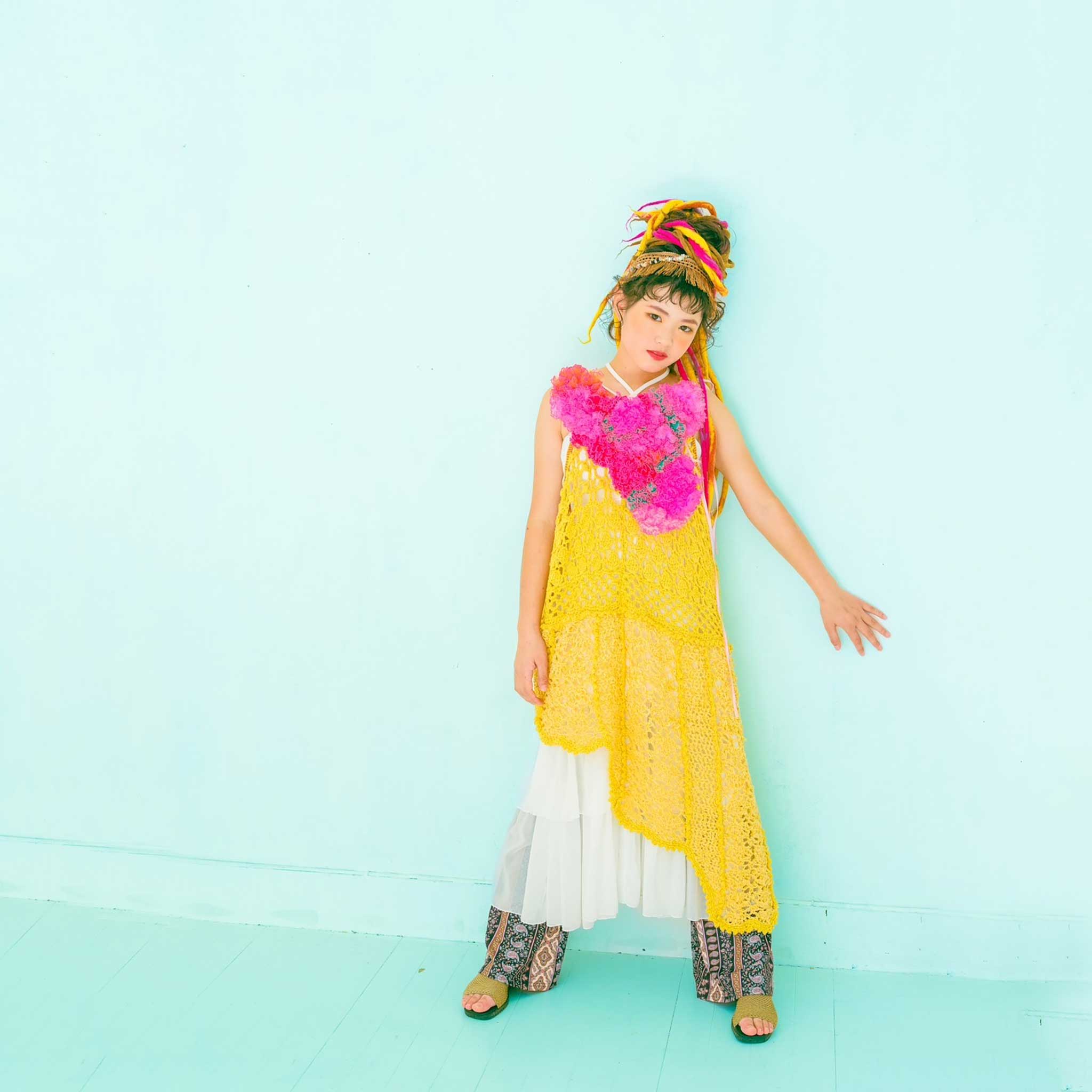 下に合わせたニットのロングドレスはヴィンテージ。アシンメトリーな丈はヒッピーやグランジなスタイルにも合いそう。