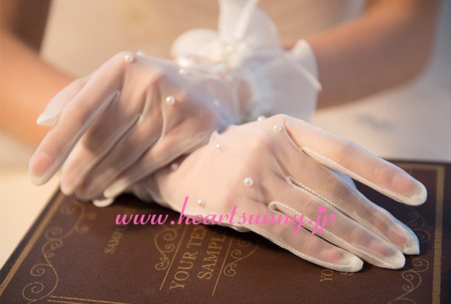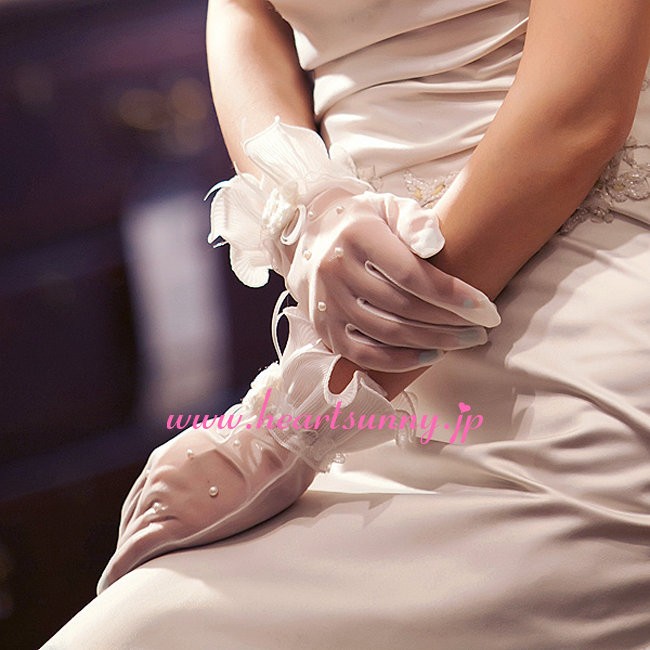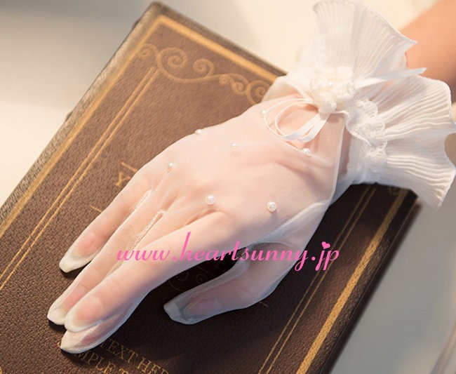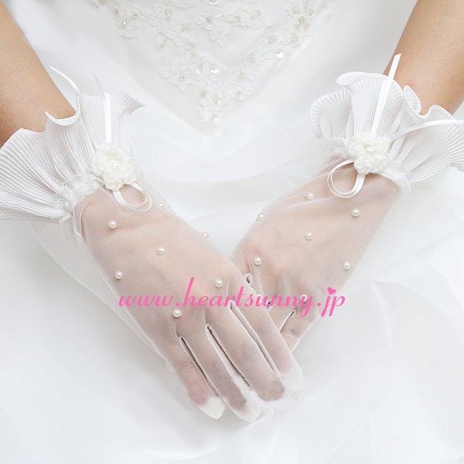 ウェディンググローブ オーガンジーショート パール リボン フリル S079