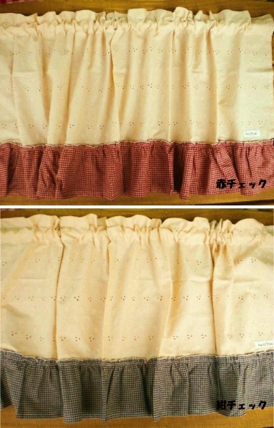 ベージュ綿レース×エンジチェック/紺チェック*下フリルカフェカーテン*50cm丈*カントリー