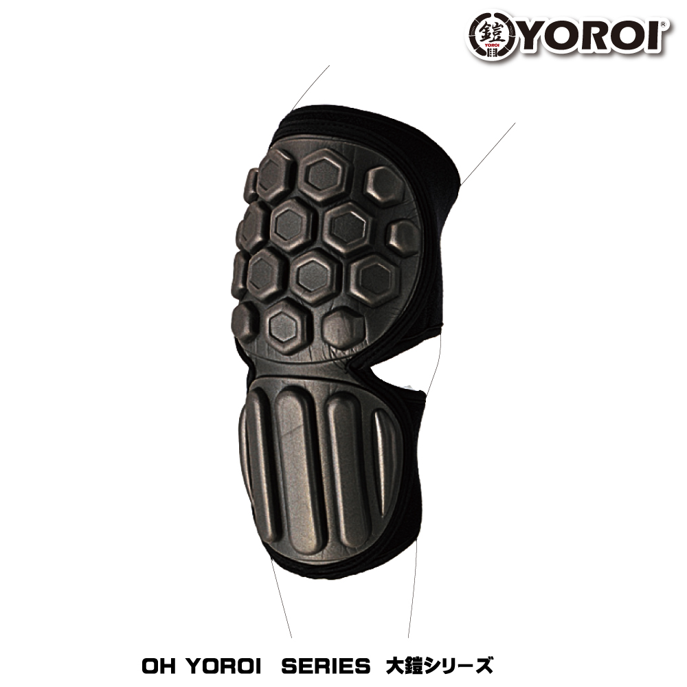 亀甲型立体モールドパッドが、肘を包み込む形状。どこでも留めらるマジックボディは、あらゆる体型のユーザーに対応する。強靭ソフトプロテクターの最上級モデル「OH-YOROI (オオヨロイ)」。