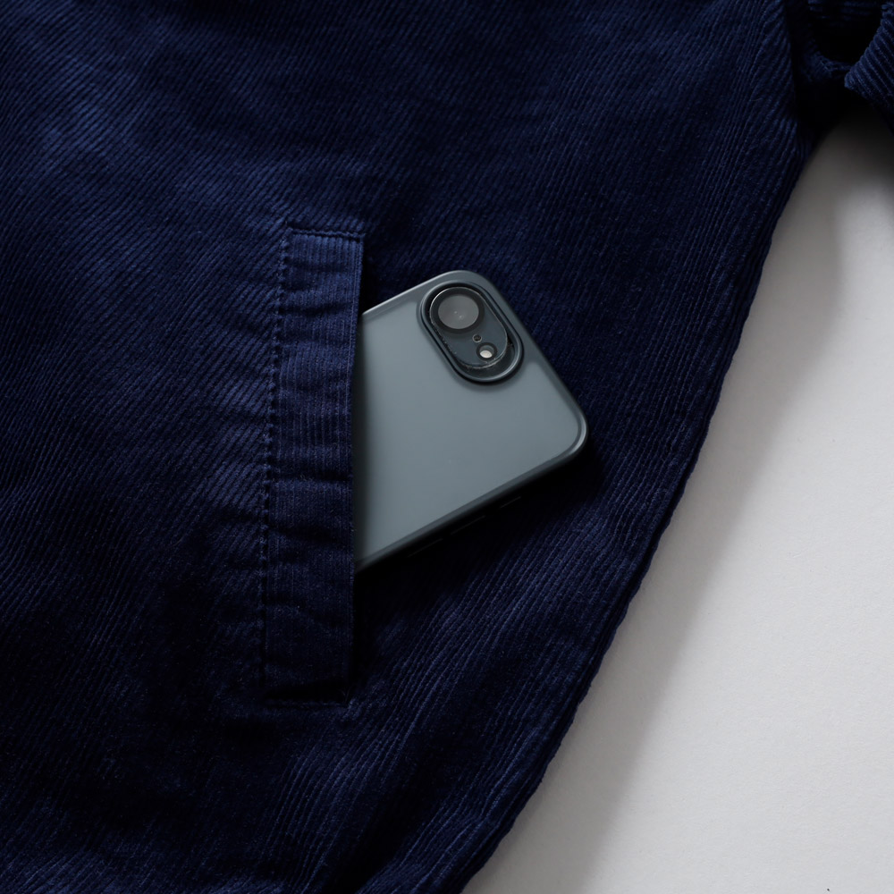 コーデュロイと聞くと重たい印象を持たれるかもしれませんが、再生繊維(セルロース)を使用した軽やかな生地感が特長。 見た目の存在感に反して、羽織り心地は驚くほど軽く、長時間着てもストレスを感じにくい仕上がりです。