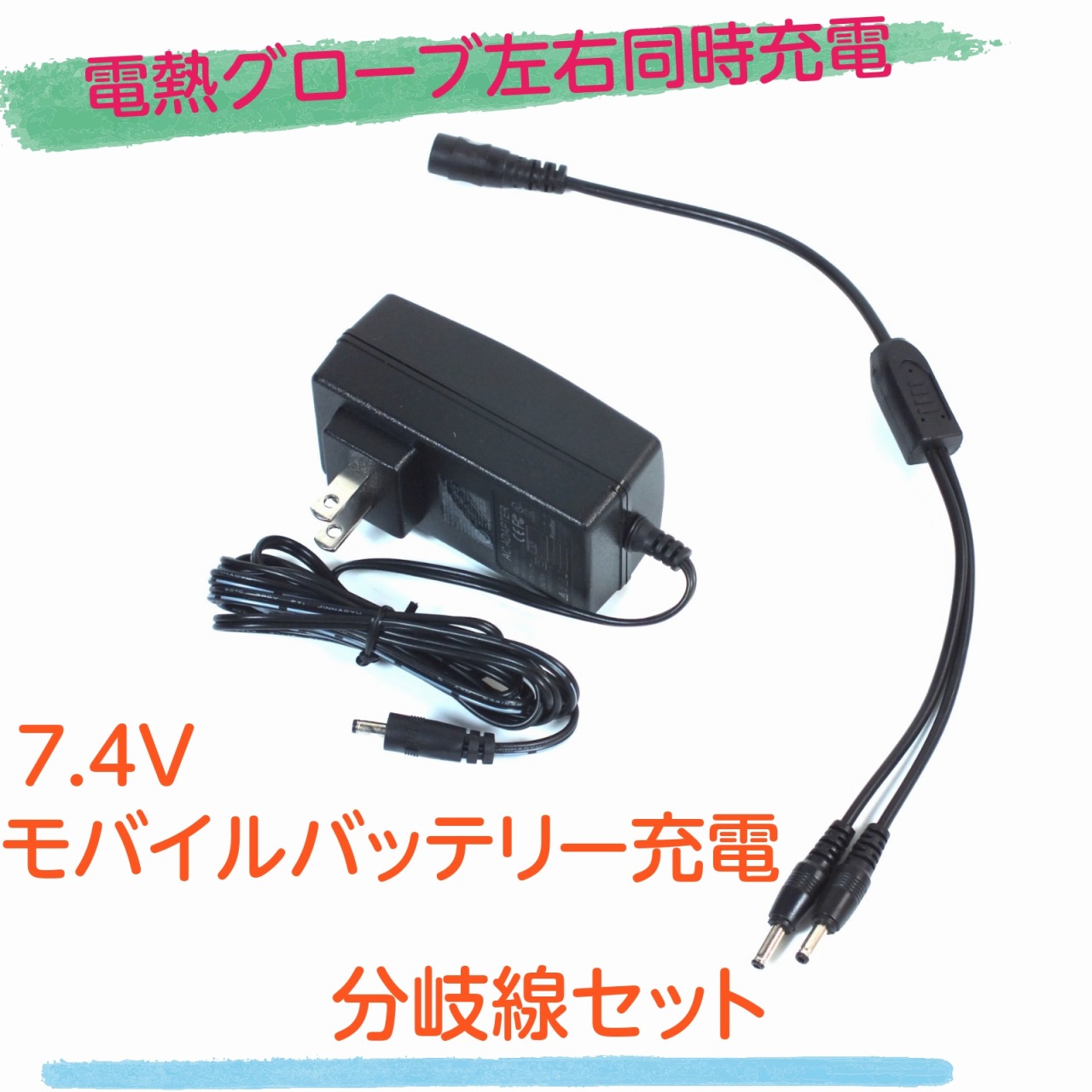 充電器 ACアダプタ 空調服 ファン付きウェア ファン付き作業着 電熱グローブ 7.4v 2口同時充電 充電用AC アダプター PSE認証 分岐線付き 電池充電器