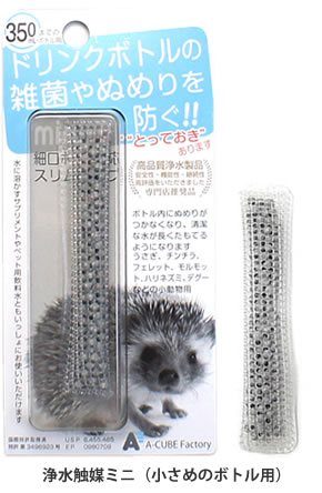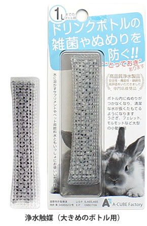 給水ボトルのお水を美味しくキレイにたもってくれる、給水ボトル用浄水触媒です。 水道水の塩素やカルキ臭さを取り、美味しいお水に。 塩素の無いお水は傷みやすくなってしまうのですが、浄水触媒を給水ボトルに入れることで雑菌を分解、衛生的な状態を保てます。 浄水触媒の入っているネットは幅が約3センチありますが、やわらかい素材ですので、ボトルの口のサイズが1.6センチあればボトル内に入れることができます。 (ネット部分の長さは約10.8センチです) 浄水触媒の効果は約1年ほどとなります。 (触媒の効果は長いのですが、長期使用によりネットが破損する場合があり触媒の表面も磨耗します。そのような場合は交換をしてください。) お手入れは、ボトルのお水を交換していただく際に、水道水でボトルの中をすすぎながら、「浄水触媒ボトル用」も同時にすすいでください。 | ドリンクボトルの雑菌やぬめりを防ぐ!! ボトル内にぬめりが付かなくなり、清潔な水が長くたもてるようになります。 水に溶かすサプリメントやペット用飲料水ともいっしょにお使いいただけます。 水中の雑菌や不純物を安全に分解・除去する製品です。 <使い方> ドリンクボトルに水道水といっしょに入れてそのままお使いください。 ペット用飲料水と併用してもヌメりや雑菌防止などの効果が得られます。 <お手入れ> ドリンクボトルの水を交換するさいに、当製品を入れたままボトルをよく振って数回すすぎ洗いしてください。 最低でも週1回はボトルの水を交換してください。 <交換時期> 強力な効果は長期間使用することで徐々に薄れていきます。 約1年の使用を目安に新しい製品に交換してください。 <用途> ペット用ドリンクボトル内のヌメり防止、雑菌防止、塩素・カルキの除去 <触媒> PIP自然触媒(Ti) 小動物や爬虫類の飲み水を浄水する「浄水触媒ボトル用」です。 原材料は特殊セラミック・チタンを使用。 小動物用の飲料ボトルに直接入れて使います。 浄水触媒を入れておくことで水道水の塩素やカルキ臭を取るとともに、(レジオネラ菌・サルモネラ菌・O−157菌・緑膿菌・)など、病原菌を殺菌する能力もあり、塩素がはいっていない状態でも水の保存ができます。 犬や猫、爬虫類用の飲料水にも、ペットボトルに入れておくなどして使用できます。 <光触媒は究極の浄水器?> 浄水効果やマイナスイオン効果が期待できます。 WPC処理(特許)により光のない場所でも触媒効果が持続! ペット用の飲料ボトルに入れておくだけで、有害な塩素などを分解するとともにカルキ臭も取り除きます。 また、酸化還元反応によりマイナスイオンを発生したり、活性酸素を分解するなどして飲料水を改善、おいしいお水に生まれ変わります。 高価な浄水器と同等の水が出来上がりますので、ペットだけでなく、人間用の飲料にも使えます。 可愛いペットと同じものを使ってみたい方は、飲料用ボトルに浄水触媒を入れることで、同じ水を体験できます。 次世代型光触媒「浄水触媒」を、ぜひペットの健康にお役立て下さい。 <ポイント!> 水道水の塩素を抜くのにかかる時間は公式には一晩としておりますが、実際にはもっと早く抜けます。 さらに早く処理したい方は、水道水を入れた後でボトルごとシェイクすると効果的です。 |