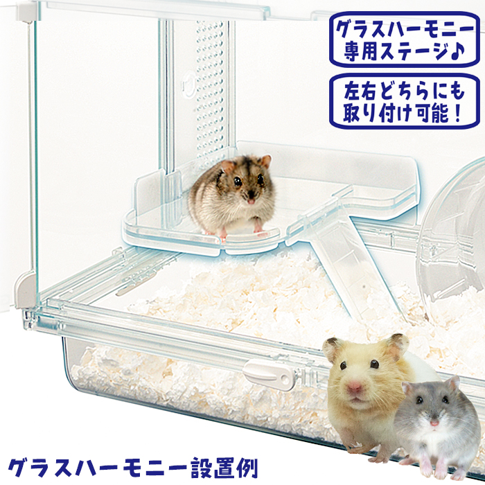 『グラスハーモニー』専用のステージです。 その他のケースやケージには、ご利用いただけません。 ケースにステージを取り付けると、ロフトスペースができ、階段で上り下りできます。 ケース内のスペースが有効活用できますし、食器をステージの上に置けは床材に埋もれてしまうこともなくなります! | 生活空間広がる「ハーモニーステージS」 グラスハーモニー専用ののぼっておりて運動できるステージ! ステージは丸洗いできるのでいつも清潔! リバーシブルでグラスハーモニーの左右どちらのボトル取付け穴にも使用可能。 【対応グラスハーモニー】 ・グラスハーモニー360シリーズ ・グラスハーモニー450シリーズ ・グラスハーモニー600シリーズ ・グラスハーモニーCUBEシリーズ(250、300) 【ご使用方法】 本製品をケージの中に入れ、付属の部品で固定し取り付けてください。 ※本製品はグラスハーモニー(別売)専用です。他のケージには取り付けできません。 |