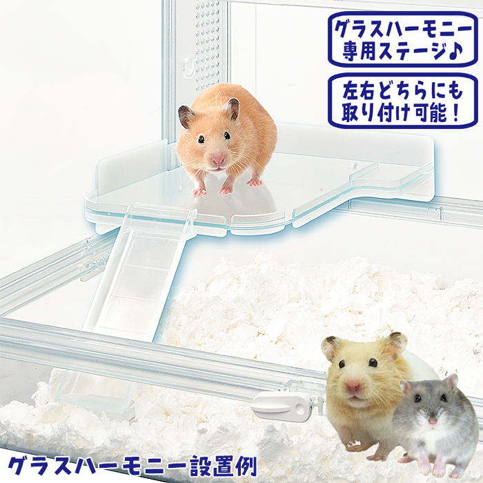 『グラスハーモニー』専用のステージです。 その他のケースやケージには、ご利用いただけません。 ケースにステージを取り付けると、ロフトスペースができ、階段で上り下りできます。 ケース内のスペースが有効活用できますし、食器をステージの上に置けは床材に埋もれてしまうこともなくなります! | 生活空間広がる「ハーモニーステージM」 グラスハーモニー専用ののぼっておりて運動できるステージ! ステージは丸洗いできるのでいつも清潔! リバーシブルでグラスハーモニーの左右どちらのボトル取付け穴にも使用可能。 【対応グラスハーモニー】 ・グラスハーモニー450シリーズ ・グラスハーモニー600シリーズ ・グラスハーモニーCUBEシリーズ(300) 【ご使用方法】 本製品をケージの中に入れ、付属の部品で固定し取り付けてください。 ※本製品はグラスハーモニー(別売)専用です。他のケージには取り付けできません。 |