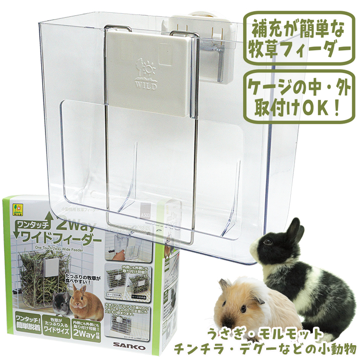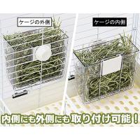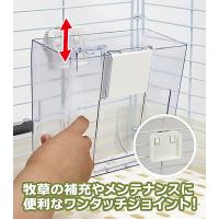 取り外しのしやすさはもちろん! 牧草の食べやすさも重視された牧草入れです。 ケージの内側でも外側でも取り付けられるので、様子をみながら食べやすい方でご利用いただくことができますね。 牧草がたっぷり入るのがうれしいです。 透明なので、ケージ正面に取り付けても牧草の残量がしっかり見えます。 ケージ正面のドア横に設置しやすい大きさです。 (イージーホーム80のドア左横にはピッタリ) 取り付け簡単、牧草がたっぷり入るワイドサイズ牧草フィーダー。 ・ワンタッチ!簡単着脱 ジョイントでワンタッチ脱着! 牧草の補充やメンテナンスが簡単にできます。 生き物には外しにくくしっかり固定ができるロック機能付き! ・牧草がたっぷり入るワイドサイズ 横幅も奥行も余裕のサイズ感。 牧草がたっぷり入ります。 食べ口も広く開いていますので牧草の取り出しが容易で食べやすい! ・内側にも外側にも取り付け可能!2Way仕様 ケージを広く使いたい時は外側に、内側に取り付けて食べやすく。 どちらにも取り付けられる2Way仕様! 皿状の底で、細かな牧草クズを受け止めます。 大きくワイドなサイズ感なのにイージーホーム80の正面にもスッキリ収まります。 |
