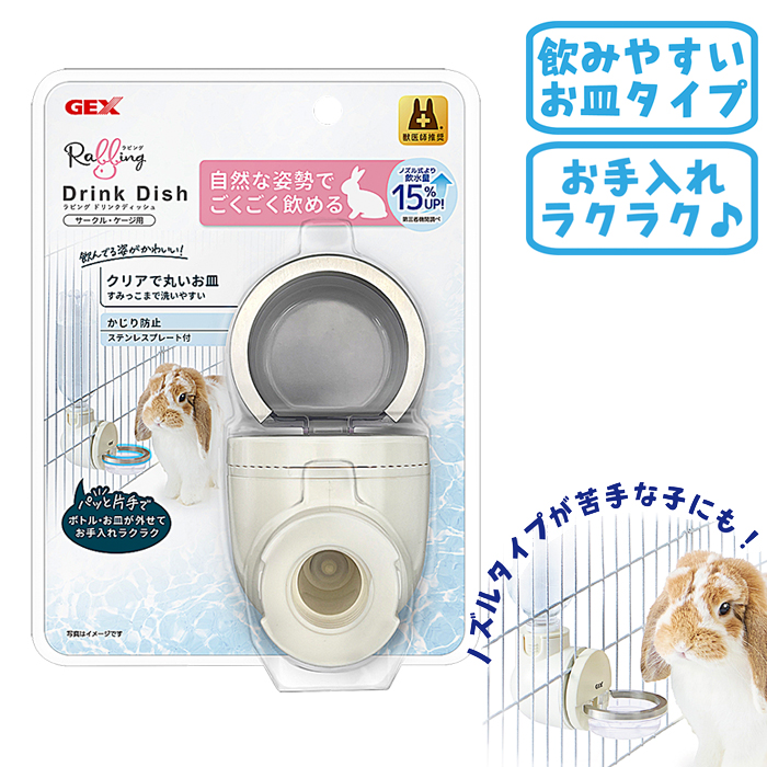 お皿タイプのドリンクボトルです。 ノズルタイプが苦手な子、しっかりと水分補給が必要な夏場、体力低下時などに、お水が飲みやすい給水ボトルです。 ケージへの取り付けも簡単で、お水の入れ替え、お皿の取り外しも簡単にできます。 ■適合ケージ■ ・ワイヤーの間隔:縦ワイヤー 22mm以上 横ワイヤー 25?28mm (ワイヤー径3mm以下) ・ワイヤー組み厚:5mm以下 自然な姿勢でごくごく飲めるディッシュタイプの給水器! 【自然な姿勢でたっぷり飲める】 従来のノズル型(吸い口をなめるタイプ)よりも自然な姿勢でゴクゴク飲めるため、飲水量が約15%アップし、ウサギの健康維持に貢献します。 【衛生的で洗いやすいデザイン】 クリアで丸みのあるお皿の形状を採用しており、汚れがたまりやすい隅っこまでしっかり洗えて清潔に保てます。 【いたずら防止のステンレスガード】 ウサギがお皿の縁をかじってしまうのを防ぐため、耐久性のあるステンレスプレートが付いています。 【着脱が簡単でお手入れラクラク】 片手で簡単にボトルとお皿を取り外せる設計になっており、毎日の水の交換や掃除がスムーズに行えます。 ●ペットボトルは、600mL以下の物をご使用下さい。 炭酸系のペットボトルがおすすめです。 ※ペットボトルの種類によっては使用できないものもあります。 |