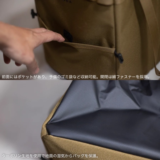 前面にはポケットがあり、予備のゴミ袋など収納可能。開閉は綿ファスナーを採用。