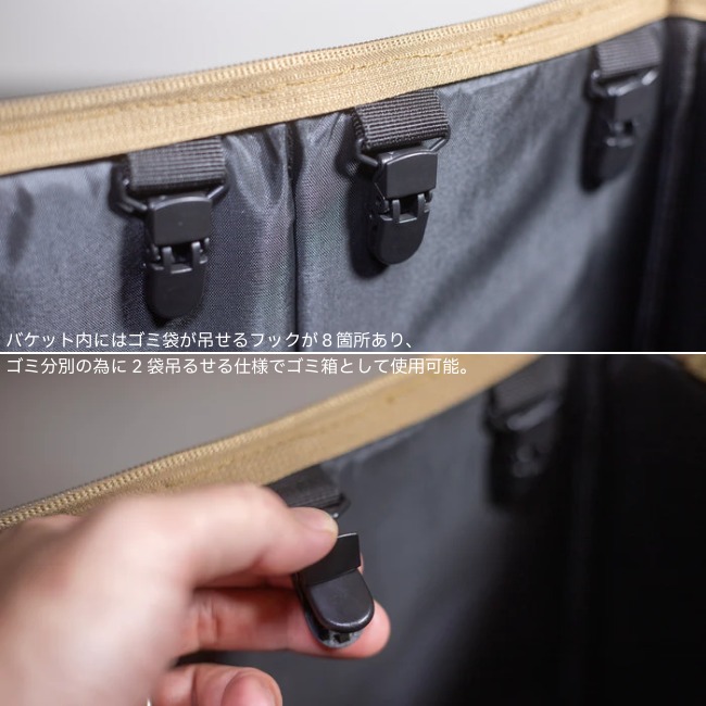 バケット内にはゴミ袋が吊せるフックが8箇所あり、