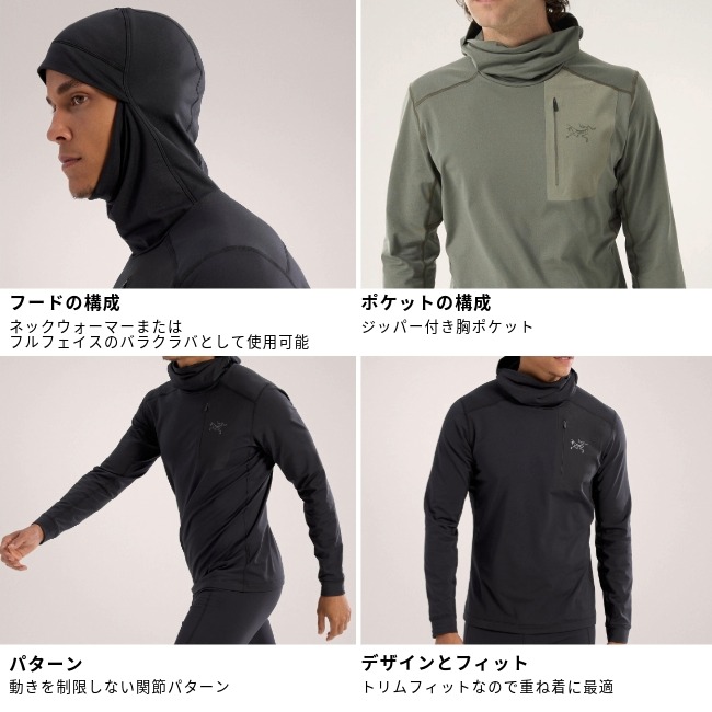 【アークテリクス ARC'TERYX ロー LT フーディ メンズ Rho LT Hoody Men's】軽量で快適なトリムフィットのベースレイヤー。気温の低い時に行う低負荷のアクティビティに最適。