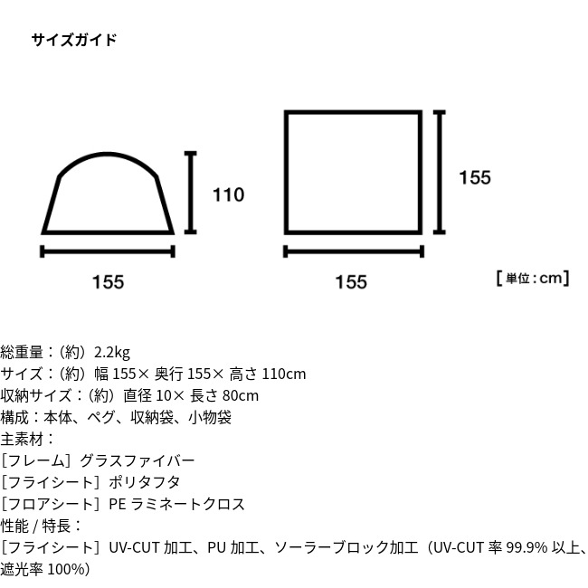 ・UV-CUT率99.9%、遮光率100%。設営約30秒のワンタッチ日よけテント。