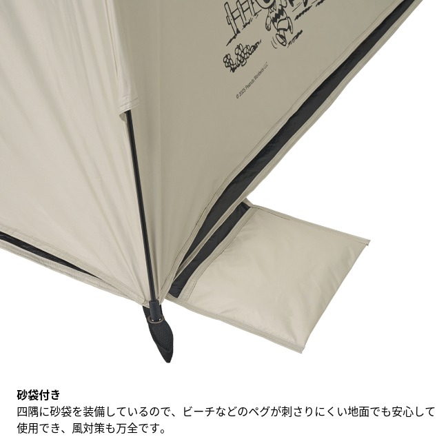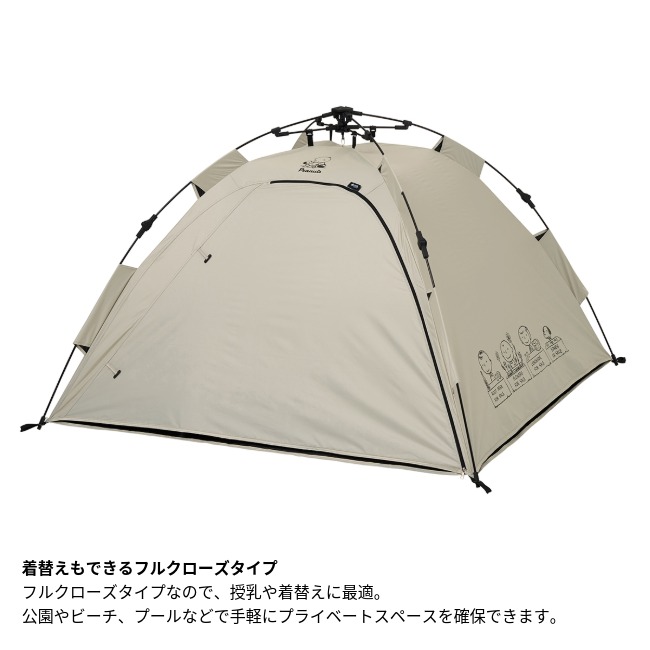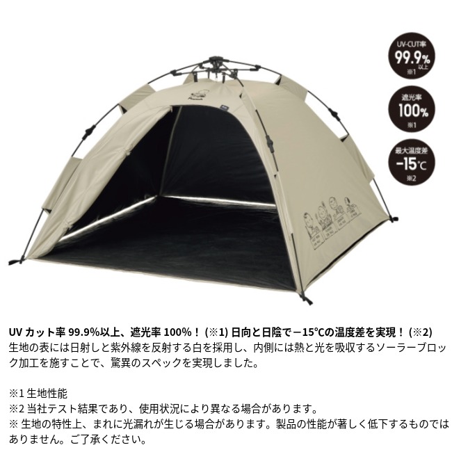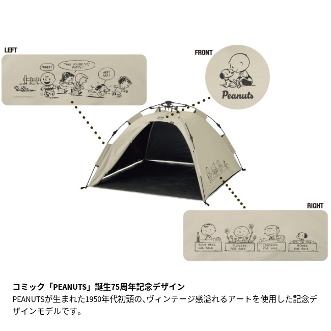 【ロゴス LOGOS SNOOPY(PEANUTS 75years)ソーラーQ-TOPフルシェード】UV-CUT率99.9%、遮光率100%。設営約30秒のワンタッチ日よけテント。