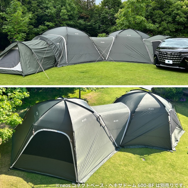 別売りの「neos コネクトベース・ヘキサドーム 600-BF」同士をつなげて無限に拡張できるトンネルタープ。