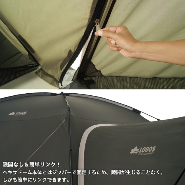 ヘキサドーム本体とトンネルタープはジッパーで連結でき、隙間なく誰でも簡単に取り付けが可能。