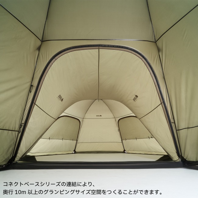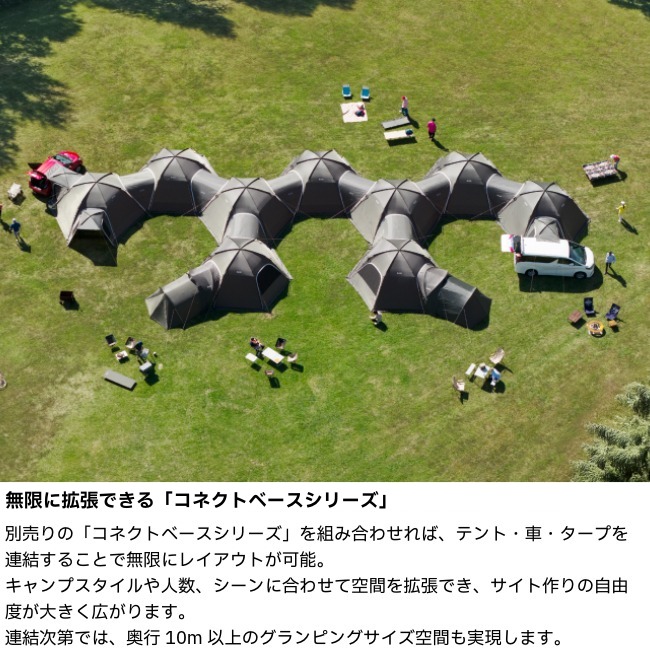 複数のベーステントをつなぐことで、グループキャンプやファミリーキャンプでも広々とした一体空間を確保。