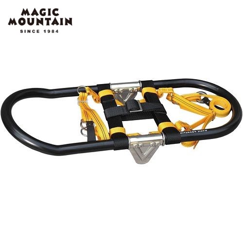 クランポン(アイゼン)を装着した登山靴へわかんを装着する際には、前後左右に動かないようしっかりと固定してください。クランポンがわかんのデッキベルトの上で動くと、クランポンの爪でわかんのデッキベルト等を損傷してしまいます。