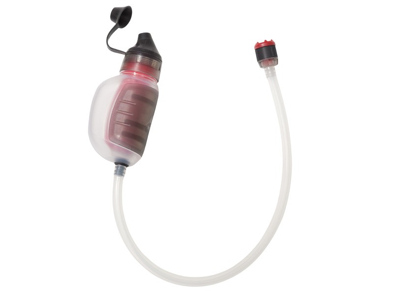 わずか145.8g と軽量、コンパクトでろ過能力も高い浄水器です。フィルターを覆う本体はポンプになっていて、握り込むだけで浄水可能。浄水しながら直接飲むことができるので、小さな水たまりからも水が得られます。もちろんボトルへの注水も可能。中空糸膜のフィルターは1分間に約1L の浄水能力があり、フィルターの寿命は約2,000L。現場でのセルフクリーニングが可能です。