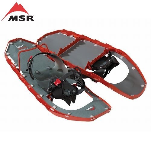 あらゆる地形に対応するMSRスノーシューのフラッグシップです。デッキを囲むフレームには鋸歯があり、フレーム自体でもグリップするため、全方位に優れたトラクションを発揮。横方向の2本のクロスメンバーにより、軽さと剛性を両立しています。丈夫でしなやかなデッキが地形に追従し、急斜面の登りやスノーシューが苦手とするトラバース時にもしっかりと地面を捉えます。登攀時にかかとを持ち上げ、つま先側に荷重をかけやすくすると同時にふくらはぎにかかる負担を軽減するテレベーターも装備しています。ハイパーリンクバインディングは、グローブをした手でも素早く簡単に脱着できるラチェット式。ベルトの長さは2段階に調節可能で、大きさが違う登山靴やスノーボードブーツにもベルトを交換せずに対応できます。歩行性能と着脱のしやすさを両立し、多くのバックカントリースノーボーダーからも支持されているモデルです。