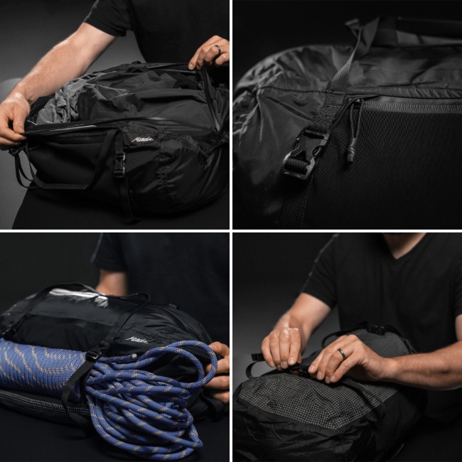 バックル開閉式のコンプレッションストラップはバックパックのストラップとして使用出来たり、カーゴラックに固定、または外部機器の取り付けが可能です。