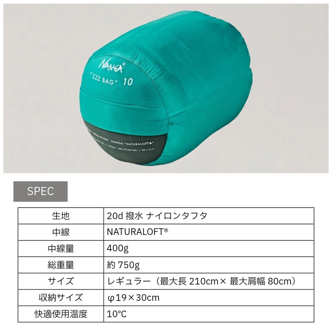 【ナンガ NANGA ZZZ BAG 10】快適使用温度10℃。夏キャンプやフェスに最適なライトモデル