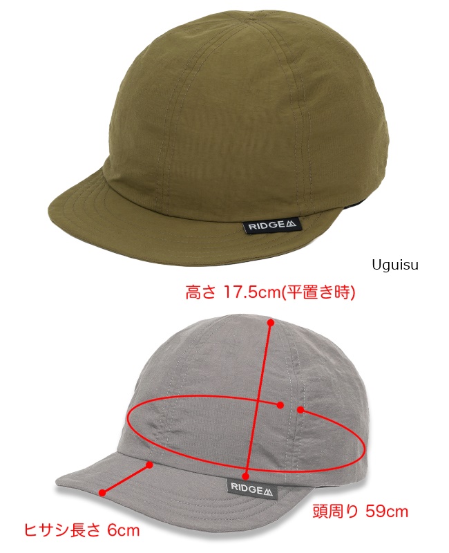 深さ:約17.5cm(平置き時)、ヒサシ長さ:約6cm、頭周り:約59cm(ゴムにより調整可能)