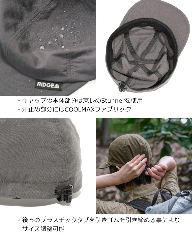 ・キャップの本体部分には撥水性、防風性、浸透性のあるナイロン100%素材、東レのStunnerを使用しています。雨風を防ぎながら発汗による不快感を防ぎ、耐久撥水機能にも大変優れています。