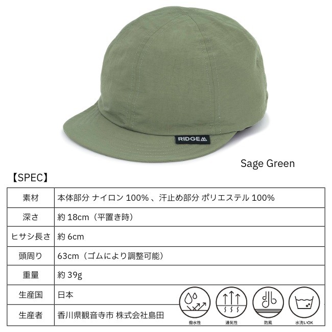 深さ 約18cm(平置き時)、ヒサシ長さ 約6cm、頭周り約 63cm(ゴムにより調整可能)