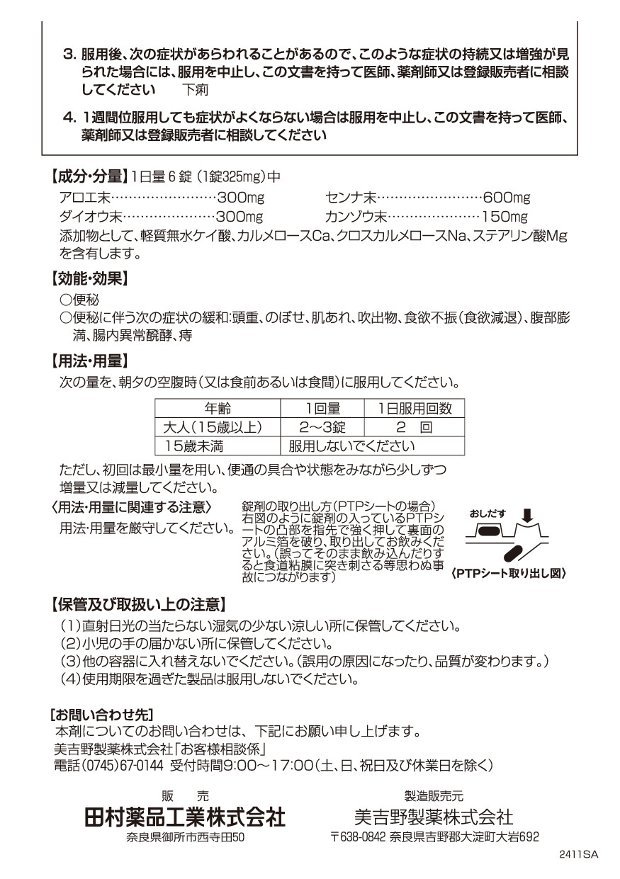 | 用法・用量 | 次の量を、朝夕の空腹時(又は食前あるいは食間)に服用してください。 大人(15歳以上):2〜3錠 2回 15歳未満:服用しないでください ただし、初回は最小量を用い、便通の具合や状態をみながら少しずつ増量又は減量してください。 <用法・用量に関連する注意> 用法・用量を厳守してください。 |