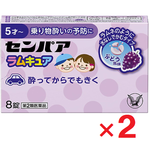 | 用法・用量 | 次の量をかむか,口中で溶かして服用してください。乗物酔いの予防には乗車船の30分前に服用してください。 なお,必要に応じて追加服用する場合には,1回量を4時間以上の間隔をおき服用してください。 [年令:1回量:服用回数] 11才以上:2錠:1日2回まで 5才〜10才:1錠:1日2回まで 5才未満:服用しないこと (用法関連注意) (1)定められた用法・用量を厳守してください。 (2)小児に服用させる場合には,保護者の指導監督のもとに服用させてください。 (3)錠剤の取り出し方 錠剤の入っているPTPシートの凸部を指先で強く押して裏面のアルミ箔を破り,取り出して服用してください。(誤ってそのまま飲み込んだりすると食道粘膜に突き刺さる等思わぬ事故につながります) |