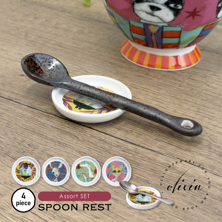 4種セット スプーン置き 箸置き カトラリーレスト スプーンレスト アニマル 羊 ウサギ 犬 猫 オリビア ボタ アーティスト ケープタウン 南アフリカ 個性的 アート カラフル 色彩 鮮やか 磁器 プレゼント 新築祝い 結婚祝い オリビアハウス 信浩コーポレーション
