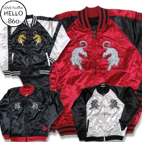 スカジャン 大きいサイズ メンズ 綿抜き サテン 龍 白虎 桜 柄 リバーシブル 刺繍 和風 和柄 /bia409