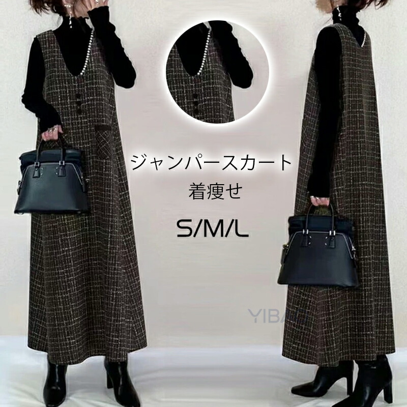 ジャンパースカート マキシ丈 チェック柄 Aライン ロング 秋 冬 大人 大きいサイズ Vネック オールインワン レディース ロングワンピース ロングベスト ワンピース ジャンスカ レイヤード 重ね着 カジュアル きれいめ ウール風 可愛い
