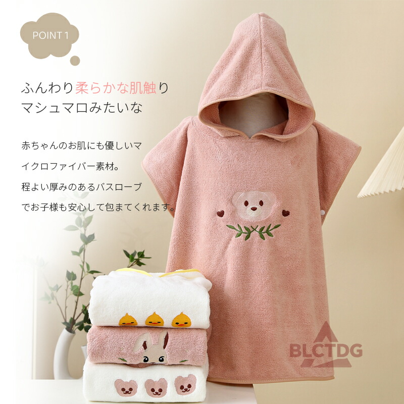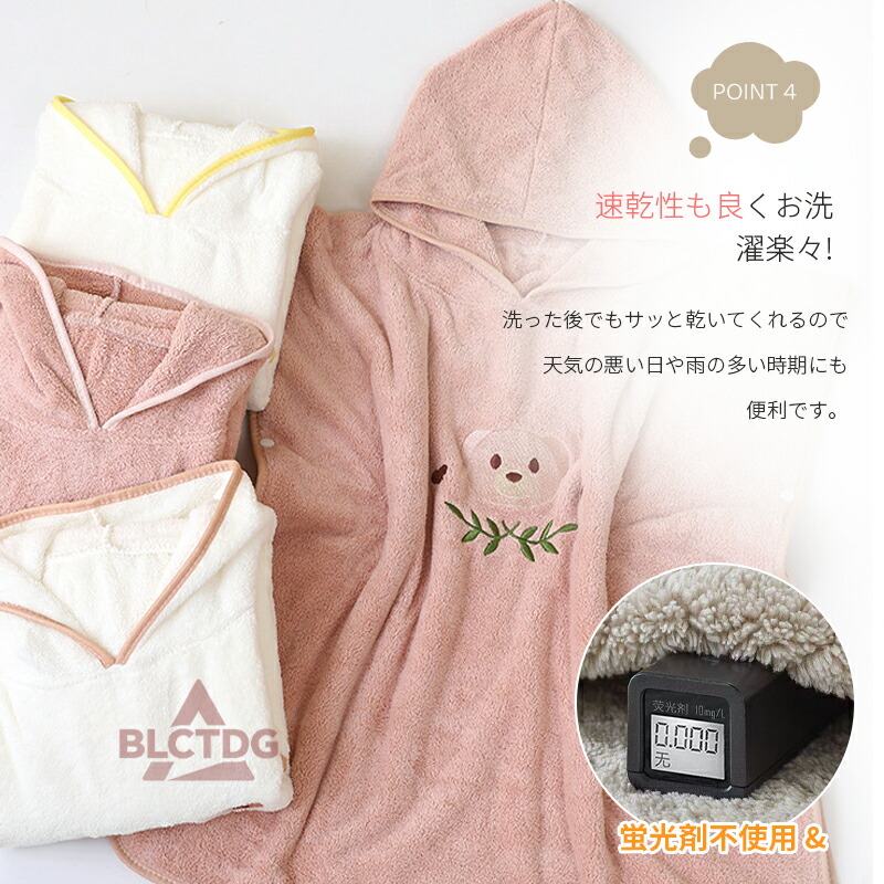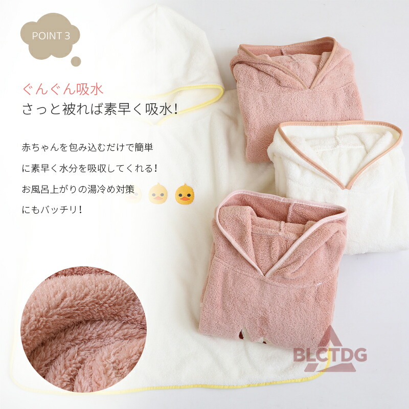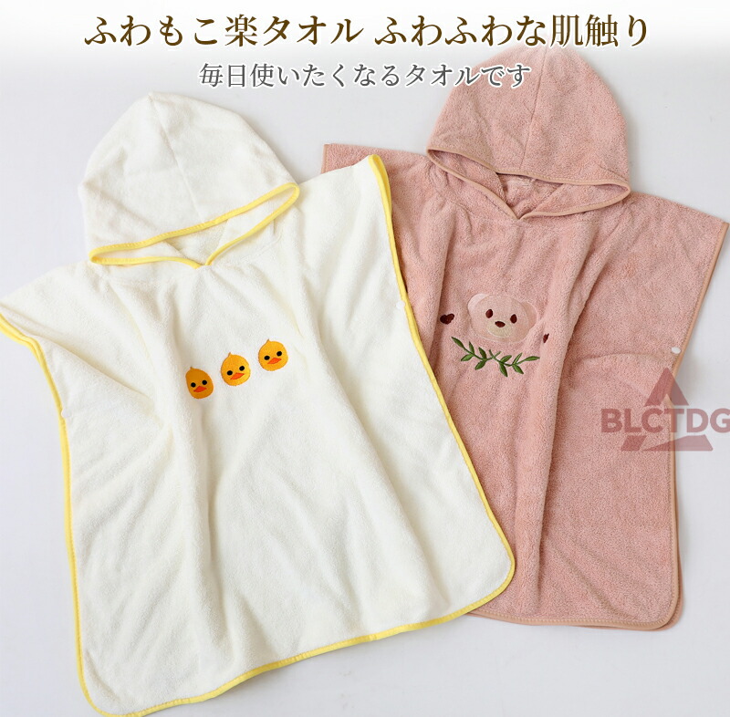 赤ちゃんからキッズまで使える大判サイズで、体全体をしっかり包み込み、湯冷めを防ぎます。