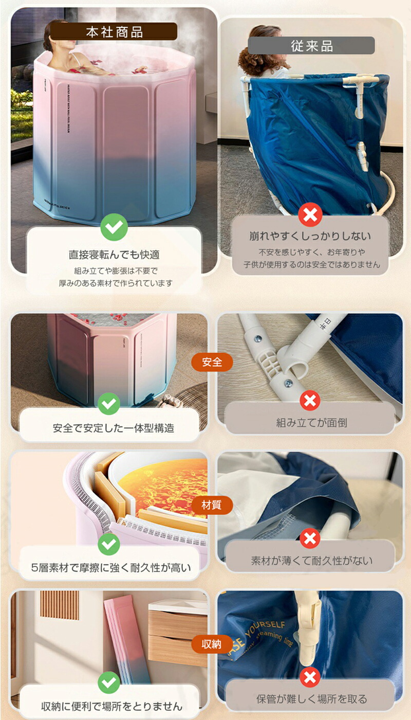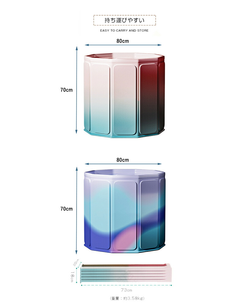 【収納簡単・組立不要】組立は不要の折り畳み式のバスタブです。コンパクトに収納でき、使わないときも場所をとらないです。軽いので携帯もしやすいです。