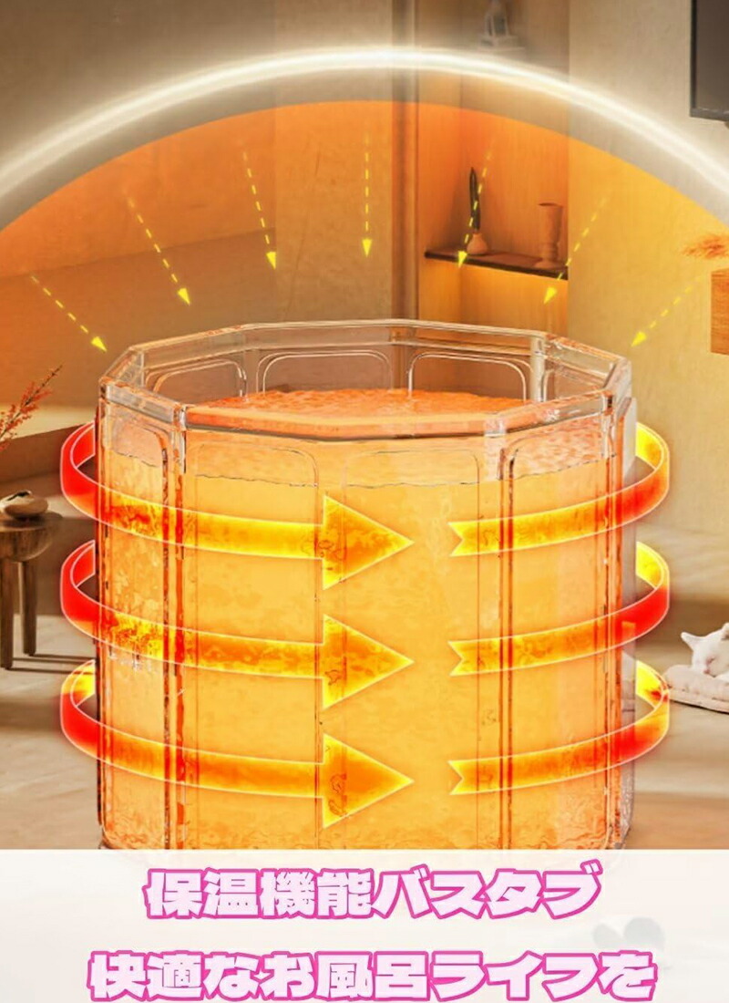 【保温機能・循環保温】折り畳み式のバスタブは垂直方向のサラウンドロック温度設計になっています。2時間ぐらいの保温効果があり、一人での快適なお風呂ライフを実現するだけでなく、家族が多く、入浴頻度が多いご家庭に最適な製品です。