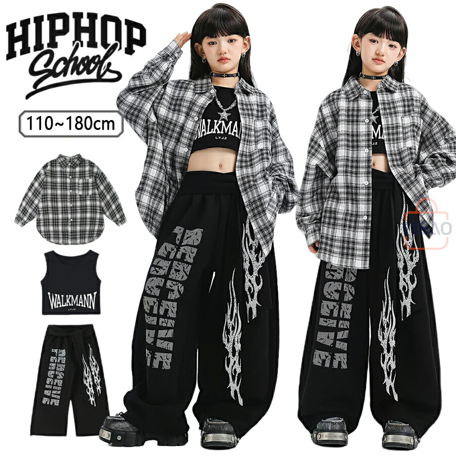 ダンス 衣装 チェック キッズ セットアップ 男女 ヒップホップ チェック柄 ダンス衣装キッズ シャツ 長袖 3点セット 黒 炎 パンツ キッズ ダンス衣装 韓国アイドル ストリート系 発表会 練習着 タンクトップ へそ出し 黒 160