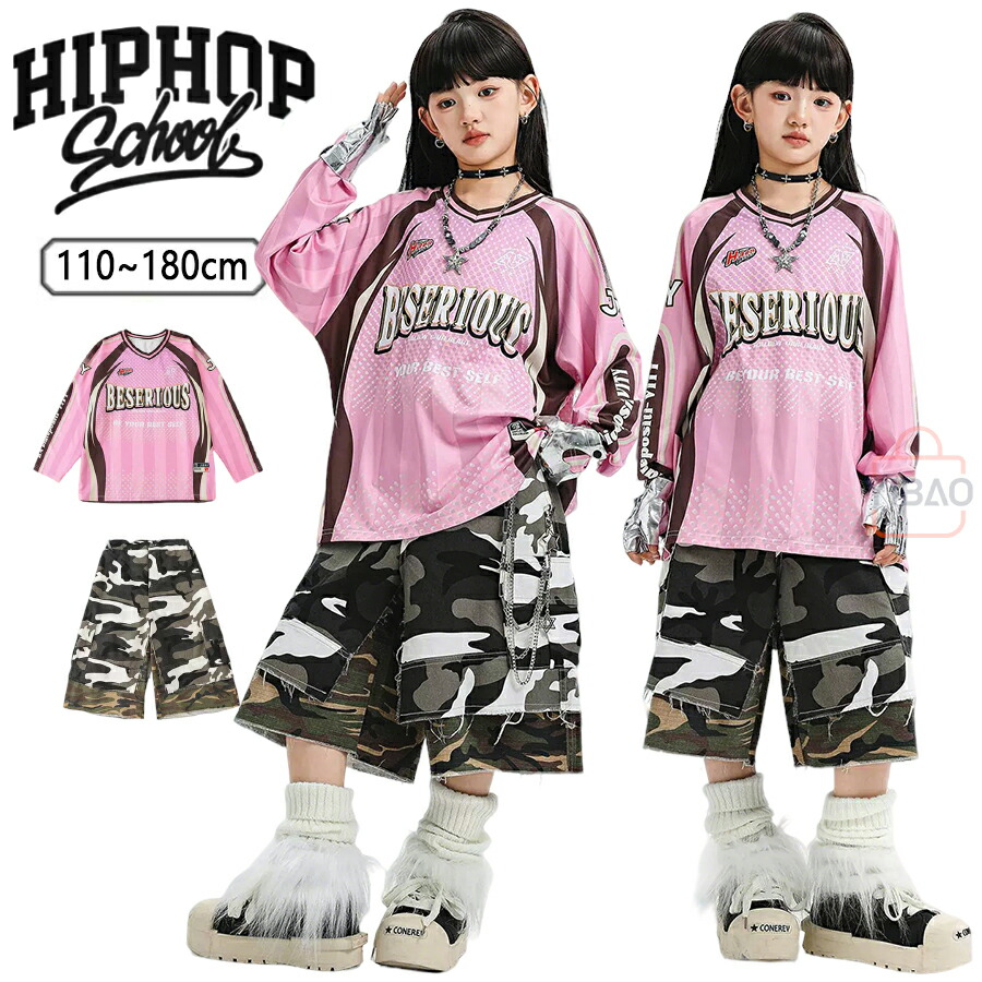 ダンス 衣装 キッズ ピンク トップス 迷彩 ハーフパンツ セットアップ 女の子 ヒップホップ k-pop 韓国 ストリート系 練習着 フットボールシャツ ダンス衣装