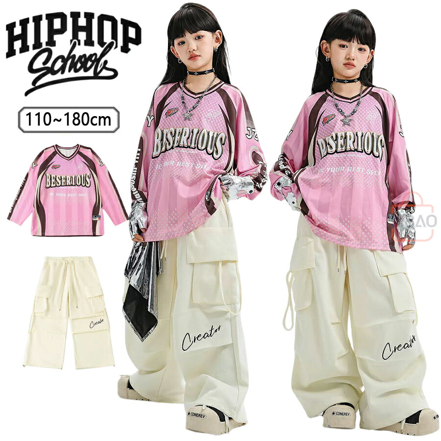 ピンク ダンス衣装 キッズ セットアップ 女の子 ヒップホップ カーゴパンツ ベージュ ピンク トップス 長袖Tシャツ KPOP 韓国 ストリート系 練習着 発表会 フットボールシャツ ダンス衣装 ピンク アイドル 衣装