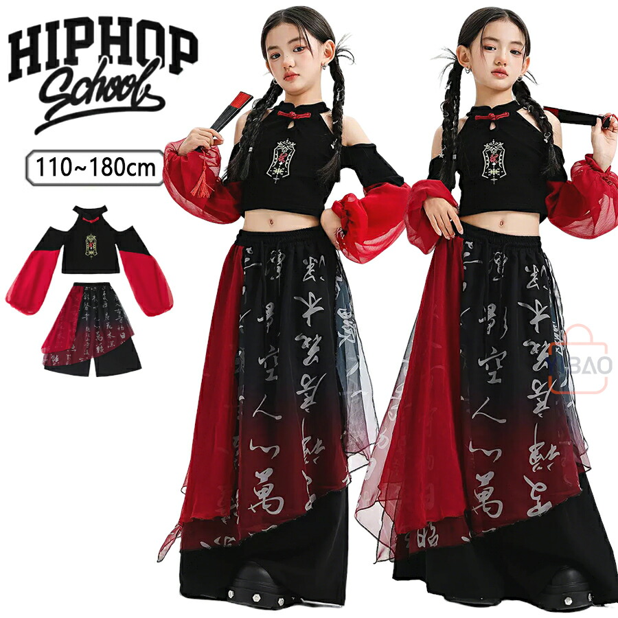 チャイナ風 ダンス 衣装 キッズ セットアップ 女の子 中華風 チャイナ服 派手 トップス へそ出し オフショルダー 赤 黒 扇子 ダンス衣装 チャイナ 発表会 ダンス衣装 パンツスカート 書道柄 チュール フレア パンツ チャイナ