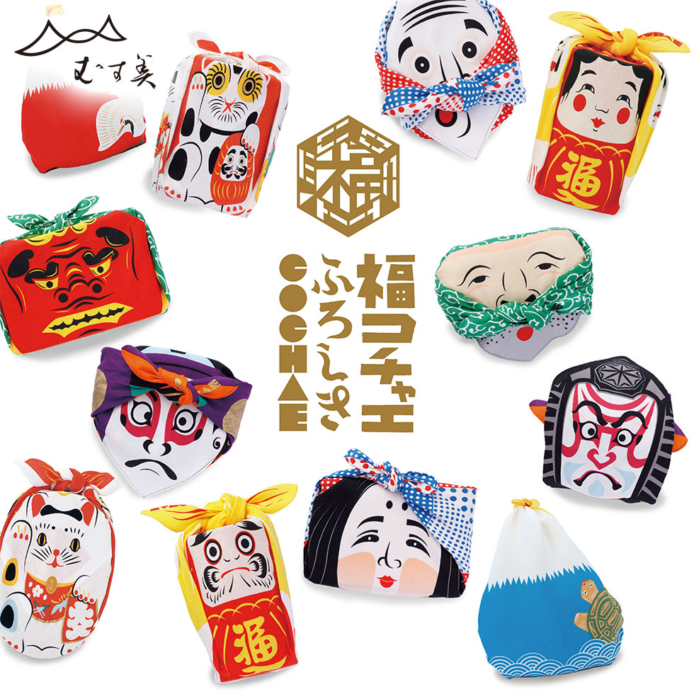 結んで楽しい。広げて楽しい。包んで楽しい。見て楽しい。くるくる来る来る福が来る。COCHAE(コチャエ)×MUSUBIの人気の縁起柄シリーズで、「かわいい開運」をテーマにしたおめでたいふろしきです。迎春や縁起をかつぎたいシーンなどにおすすめです。