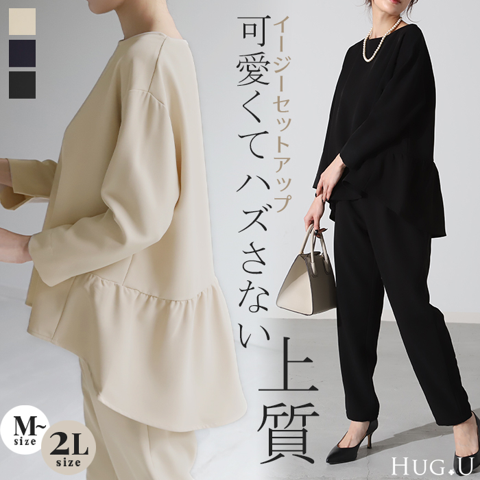 セレモニー ペプラムトップス 上下セット オケージョンスーツ セットアップスーツ アウター ズボン ボトムス ボトム ロングパンツ チュニック丈 フォーマルスーツ マザースーツ タックパンツ 長袖 丸首 ラウンド テーパード スラックス ストレート シャツ ブラウス フリル裾 バックフリル 卒園式 入園式 無地 薄手 裏地 ブラック 黒 ネイビー 紺 紺色 ベージュ ゆったり 仕事 ゴムウエスト 旬 トレンド プラスサイズ オーバーサイズ 大きい 大きめ フリーサイズ フリー S M L LL 2L XL 3L XXL LLL カジュアル シンプル 大人 大人カジュアル オトナ 女性 綺麗 きれい キレイめ きれいめ 高見え 上質 上品 20代 30代 40代 50代 60代 おしゃれ お洒落 オシャレ カッコいい カッコイイ 春 夏 秋 冬 春夏 秋冬 HUG.U HUGU ハグユー はぐゆー 入学式 卒業式 セレモニースーツ オケージョン レディーススーツ 母 ロング ずぼん ママ ママスーツ 大きいサイズ