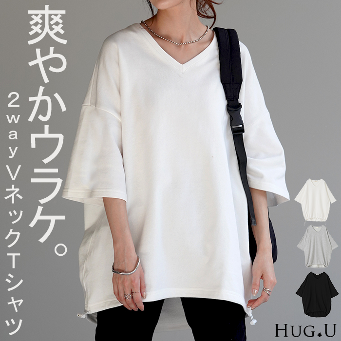 Tシャツ トップス ティーシャツ ティシャツ 半袖Tシャツ ビッグTシャツ ビックTシャツ 二の腕隠し ドロップショルダー ゆるT ゆったり ゆったりサイズ 袖あり 長い 長め 綿 コットン コットン100% コットンTシャツ V字ネック 7分袖 5分袖 五分袖 半袖 半端袖 ブラック 黒色 ホワイト 白色 オフホワイト グレー 灰色 ライトグレー レディースファッション 旬 トレンド プラスサイズ オーバーサイズ 大きい 大きめ フリーサイズ フリー S M L LL 2L XL 3L XXL LLL カジュアル ベーシック オフィス オフィスカジュアル 着回し シンプル 大人 大人カジュアル オトナ 女性 綺麗 きれい キレイめ きれいめ 高見え 上質 上品 20代 30代 40代 50代 60代 おしゃれ お洒落 オシャレ 春 夏 秋 冬 春夏 秋冬 HUG.U HUGU ハグユー はぐゆー 裏毛 七分袖 ドローコード プルオーバー すっきり見せ お尻が隠れる 二の腕カバー チュニック レカットソー 大きいサイズ