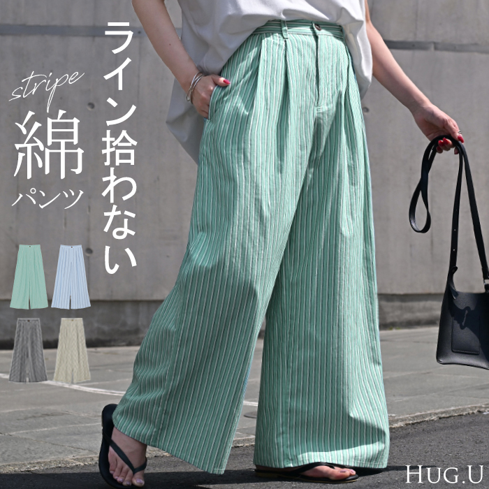 パンツ ワイド ストライプ 綿100 レディース ワイドパンツ 柄 ロング ロングパンツ 薄手 体型カバー ボトムス ボトム ストレート ズボン ゆったり ハイウエスト