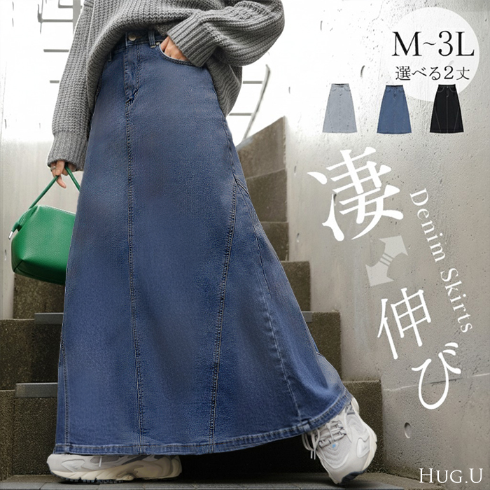 デニムロングスカート ロングデニムスカート ゴムウエスト センターライン センターラインスカート ステッチ入り ステッチスカート YKK YKKファスナー ファスナー ジップ ジッパー ZIP zip ジップアップ チャック ポケット付き ポッケ 伸縮性 伸縮 伸びる ウルトラストレッチ ストレッチスカート ライトブルー ブルー ブラック 青色 水色 旬 トレンド プラスサイズ ビッグシルエット ビッグ ビック big ビックサイズ ビッグサイズ オーバーサイズ 大きい 大きめ フリーサイズ フリー S M L LL 2L XL 3L XXL LLL カジュアル ベーシック オフィス オフィスカジュアル 着回し シンプル 大人 大人カジュアル オトナ 女性 綺麗 きれい キレイめ きれいめ 高見え 上質 上品 20代 30代 40代 50代 60代 おしゃれ お洒落 オシャレ 春 夏 秋 冬 春夏 秋冬 HUG.U HUGU ハグユー はぐゆー マキシ マキシスカート 長い 大きいサイズ 体型カバー ゆったり ストレッチ ゴム ハイウエスト おしゃれ