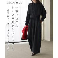 オールインワン ジャンプスーツ イージーケア レディース パンツ ロング ロングパンツ ジャガード シワになりにくい トレンチ クルーネック