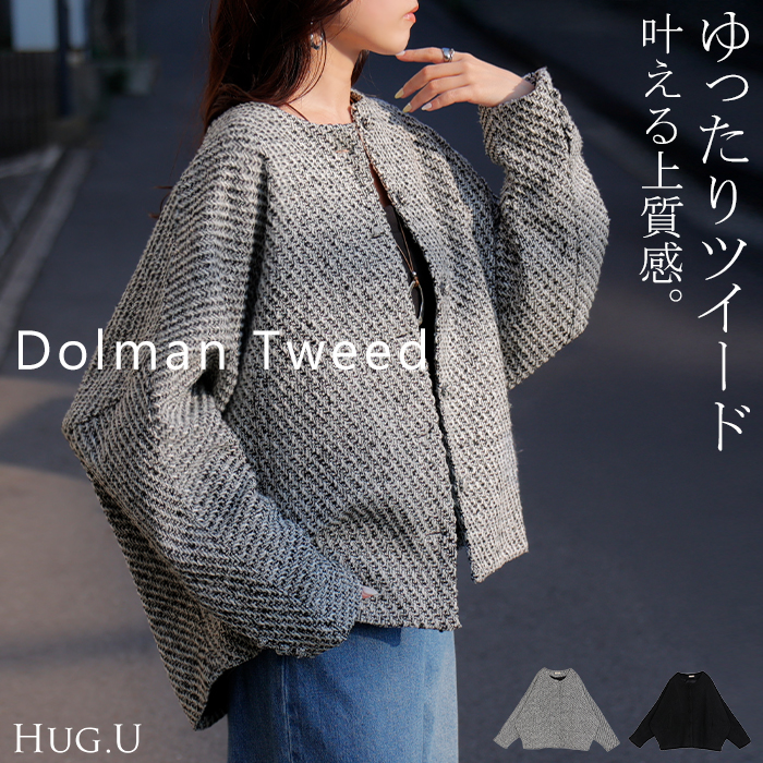 ジャケット ノーカラー ツイード ドルマン ワイド レディース ロング コートドルマンアウター 長袖 羽織 襟無し バンドカラー ライトアウター ドルマンアウター ドルマンジャケット ドルマンコート ドルマンブルゾン ドルマン袖 ドルマンスリーブ ドルマンスリーヴ ツイードアウター ツイードジャケット ツイード生地 くるみボタン お洒落ボタン 裏地 裏地付き ポケット サイドポケット ぽっけ オーバーサイズ 大きいサイズ 重ね着 体型カバー 二の腕カバー きれいめ 黒 ブラック 白 ホワイト 旬 トレンド オフィス オフィスカジュアル 着回し シンプル スタイルアップ 大人 大人カジュアル オトナ 女性 綺麗 きれい キレイめ 高見え 上質 上品 20代 30代 40代 50代 60代 おしゃれ お洒落 オシャレ 着映え 春 夏 秋 冬 春夏 秋冬 HUG.U HUGU ハグユー はぐゆー 襟無し ライトアウター ツイード生地 オーバーサイズ 大きいサイズ 重ね着 体型カバー 二の腕カバー きれいめ